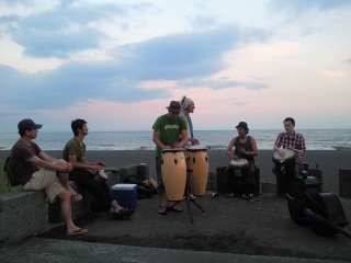 海の男たちは、たまたま海辺でジャンベ等を鳴らしている方々がいたので、混じってみました。
